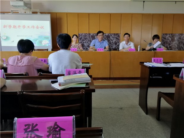 在新学期的开学工作会议上,钱国云校长介绍了新学期的工作思路,提出了本学期学校的总要求:适应新形势,保持优势,管理再上新台阶,工作再出新成果。他强调要抓好六项建设:文化建设、队伍建设、课程建设、装备建设、家校关系建设、学生品行建设。尤其指出全体教师在师德师风上要有更高的要求,师德上要爱岗敬业,师能上要有高攀升,使全体教师明确了本学期的奋斗目标。