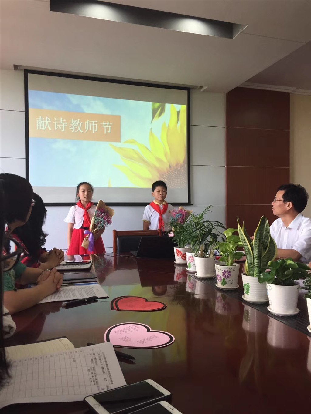 活动开展之时,恰逢教师节到来,两位来自四年级3班的小朋友,手捧花束给在座的所有老师献上了一首《老师,您好!》。饱满的感情,抑扬顿挫的语调搭配上孩子稚嫩的嗓音给大家带来了一场视听盛宴。