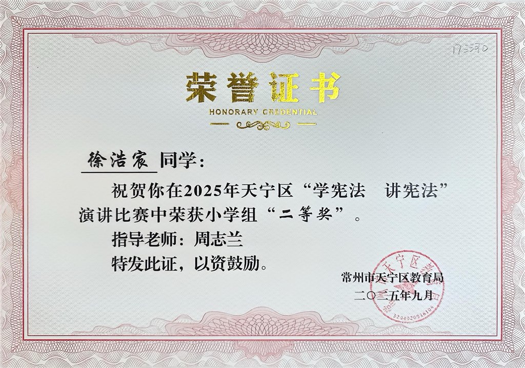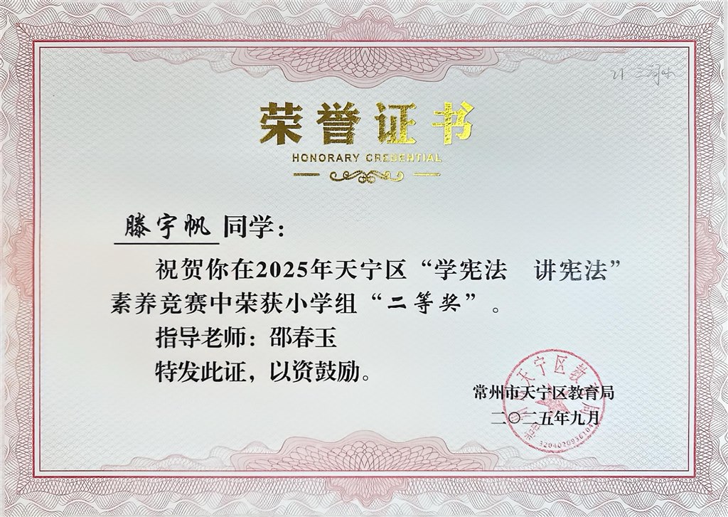 您现在的位置:常州市三河口小学>>校园新闻>>家有喜事>>2025年德育荣誉:区学宪法、讲宪法活动中,徐浩宸获演讲二等奖、滕宇帆获素养竞赛二等奖