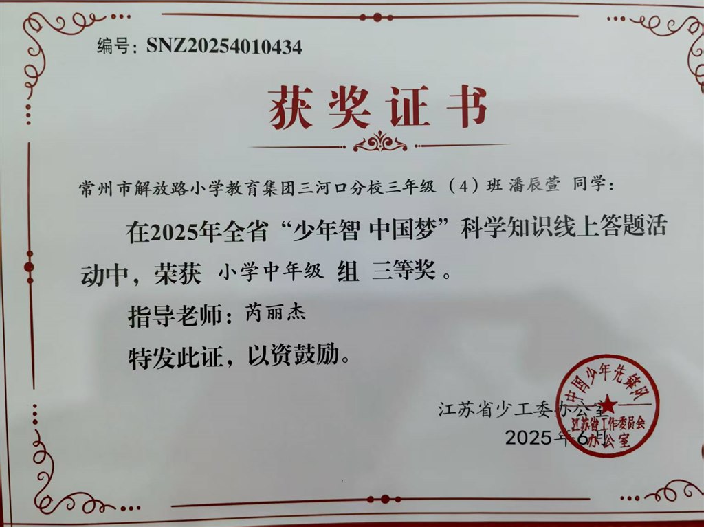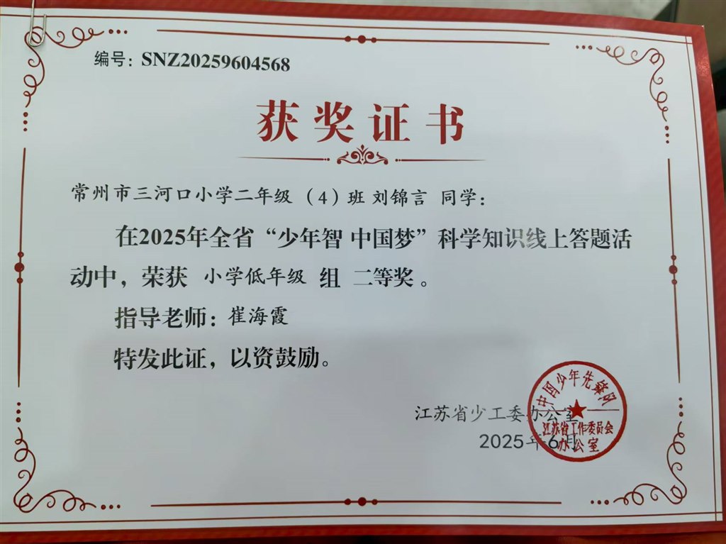 您现在的位置:常州市三河口小学>>校园新闻>>家有喜事>>2025年德育荣誉:在省“少年智 中国梦”科学知识线上答题活动中,刘锦言获二等奖、潘辰萱获三等奖