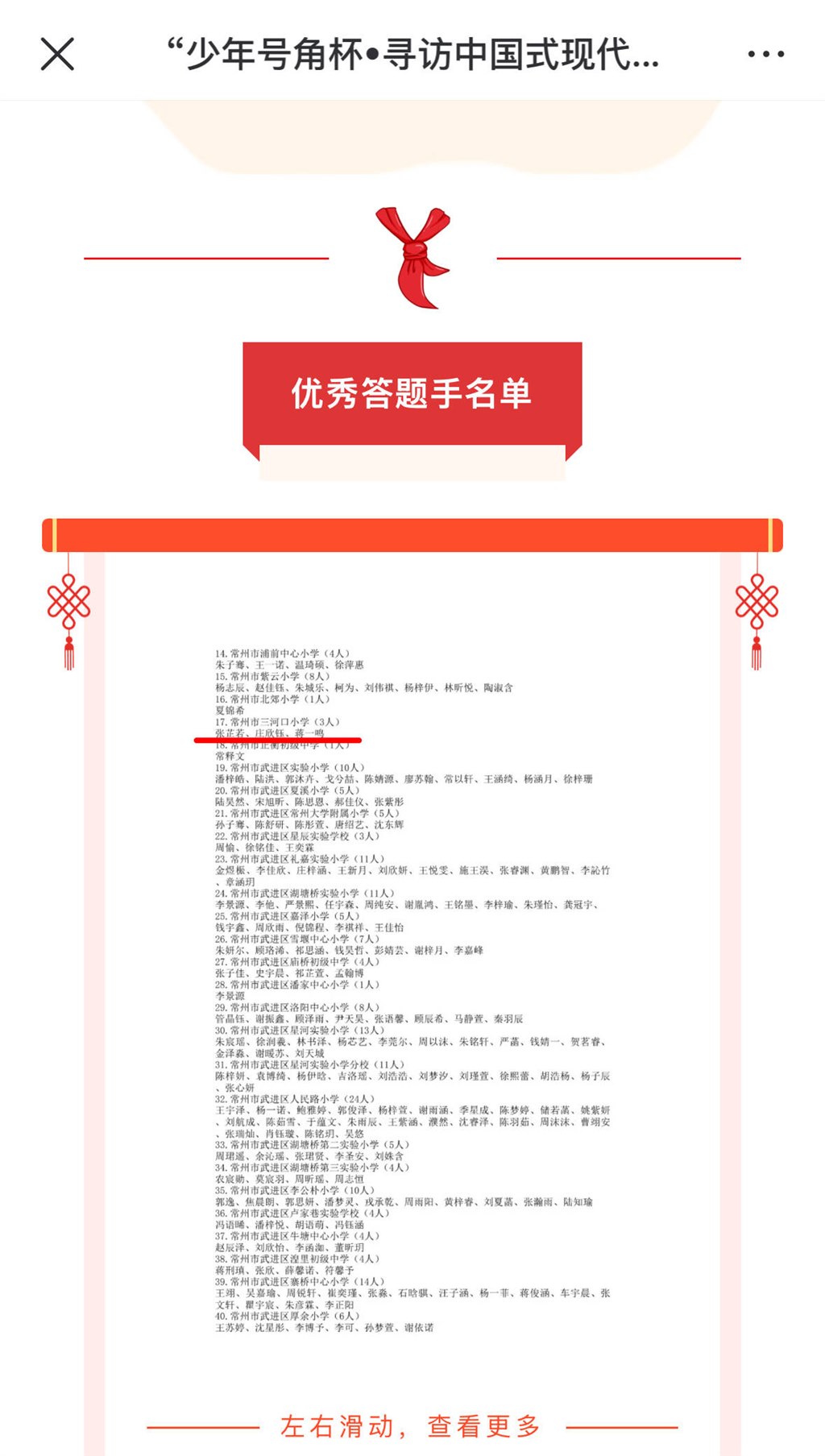 在2025年“少年号角杯·寻访中国式现代化,做新时代好队员”知识竞赛中五(1)蒋一鸣、四(4)庄欣钰、张芷若获“优秀答题手”,陆萍芬获优秀辅导奖。
