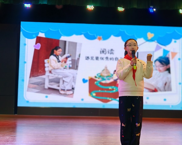 紧接着,五、六年级的同学们带来了生动的阅读故事分享。他们结合精心制作的PPT,讲述自己与书籍的不解之缘、阅读中的感悟与收获。一个个真挚动人的故事,一段段发自内心的感悟,不仅展现了同学们的阅读成果,更传递出书籍带来的成长力量。舞台上,每一位选手都自信大方、表达流畅,用真诚打动着现场每一位观众。
