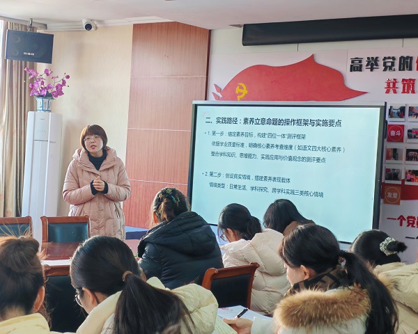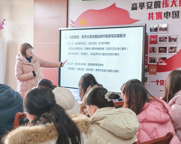 在学习“核心素养导向下的考试与命题变革”环节,教研组重点探讨了三大路径:一是加强教研培训,提升教师命题能力,确保命题严格依据课程标准,强化素养导向;二是构建构建“四位一体”的测试框架,推动命题从知识立意转向素养立意;三是分享了语文等学科“主题化情境命题”的实践案例,如“文学招募”“亚运小使者”等任务群设计,为各学科命题改革提供了鲜活借鉴。