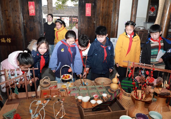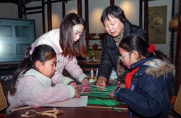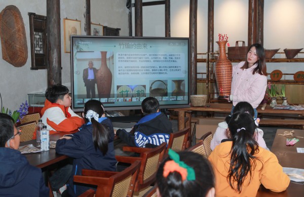 栽下竹苗,同学们对竹子的好奇更浓了:这些竹子将来能变成什么呢?带着疑问,大家走进了焦溪古镇竹编非遗馆。在这里,竹子的“魔法”震撼了每个人。非遗竹编传承人姚梓冉老师向大家展示了精巧的东姚竹篮、焦溪竹编等作品,并讲述了竹编技艺代代相传的故事。最令人兴奋的是动手体验环节,在姚老师手把手的指导下,同学们尝试“穿、绕、编”,亲眼见证普通的竹篾在自己手中开始发生变化。亲手触摸,方知不易,家乡这项古老技艺的智慧与精巧,让同学们深感自豪。