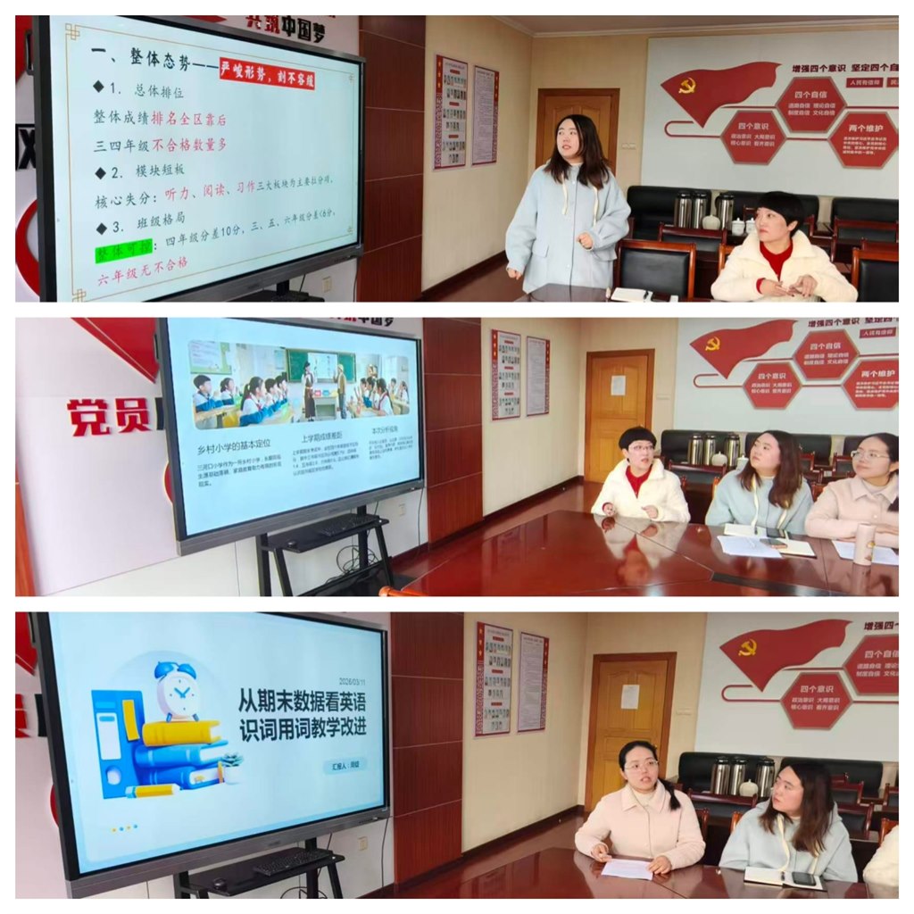 会上,三河口分校的语数英三位学科责任人依次作汇报。语文组锚定教学短板,制定八大举措精准施策;数学组梳理亮点,锚定学段衔接等三大问题提出改进措施。英语组以提升学生识词用词能力为小切口,搭建教用连接桥梁。三河口分校教学分管副校长张春燕围绕“我们在哪里、我们去哪里、我们怎么去”三大核心问题,明确教学改进方向,表达了全体教师的育人决心。
